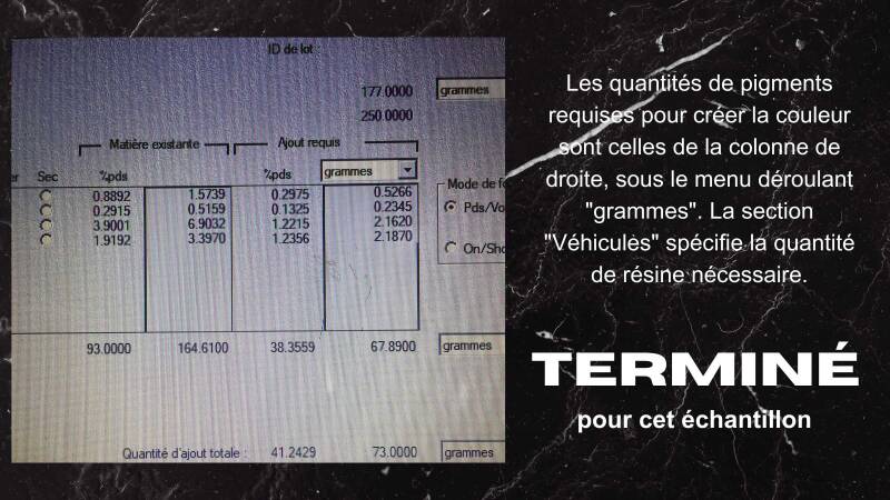 Veuillez consigner les poids mesurés et non les quantités fournies par le logiciel de formulation dans le tableur ci-dessous pour déterminer la quantité finale de colorant à utiliser.